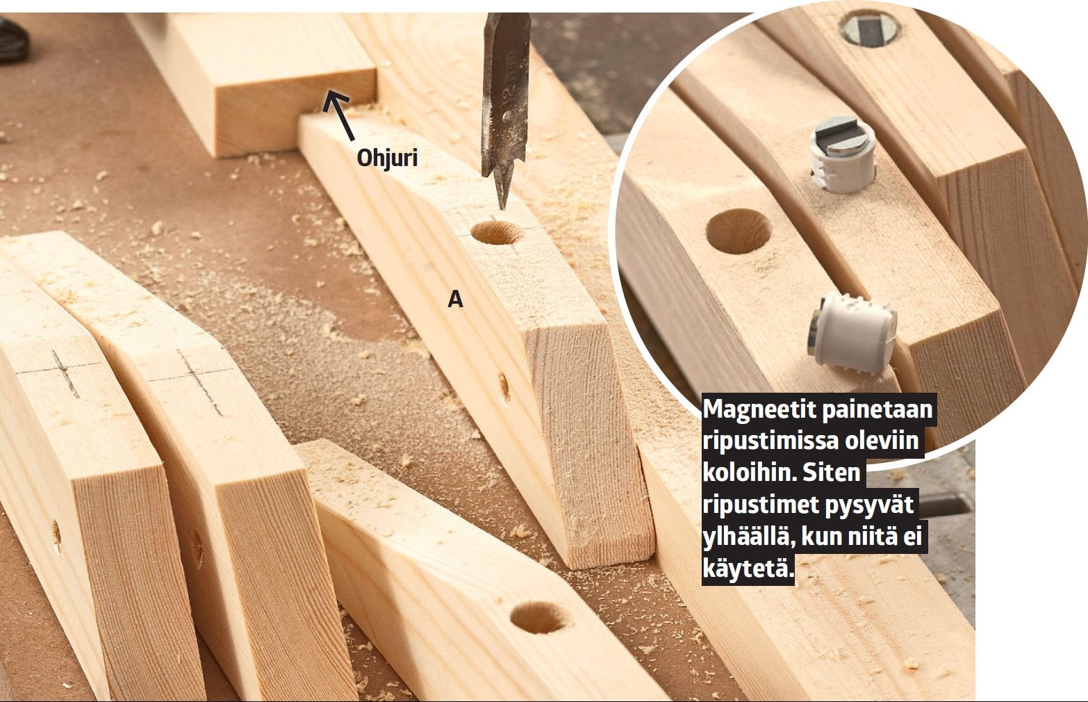 Ripustinten tekemiseen kannattaa rakentaa pari apuvälinettä. Terävä pää on helppo sahata, kun kapulan toinen pää painetaan kiinni 45 asteen loveen.