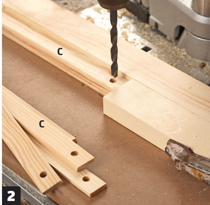 Poraa reunimmaisiin rimoihin (B) reiät, joissa on tilaa aluslevyille ja muttereille. Poraa sentin syvyinen reikä 20 millin terällä.