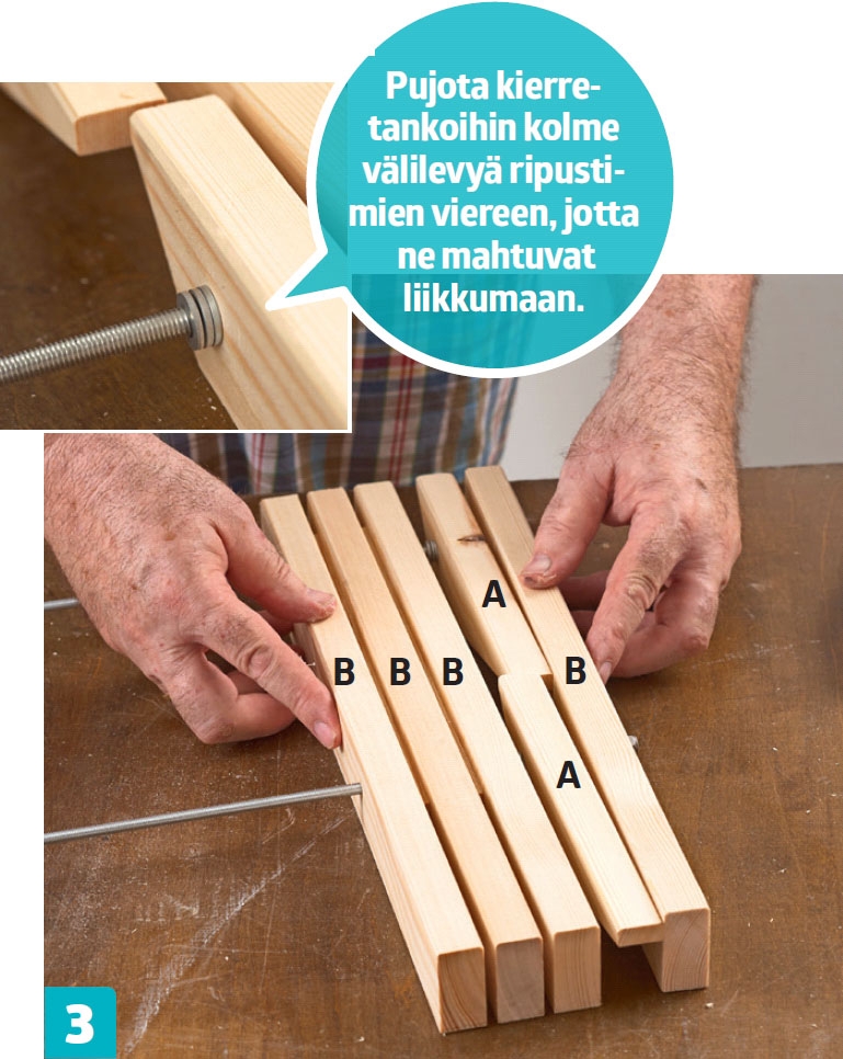 Reunimmaisiin rimoihin (B) porataan kaksi laajempaa reikää kierretankojen kiinnitysmuttereita varten.
