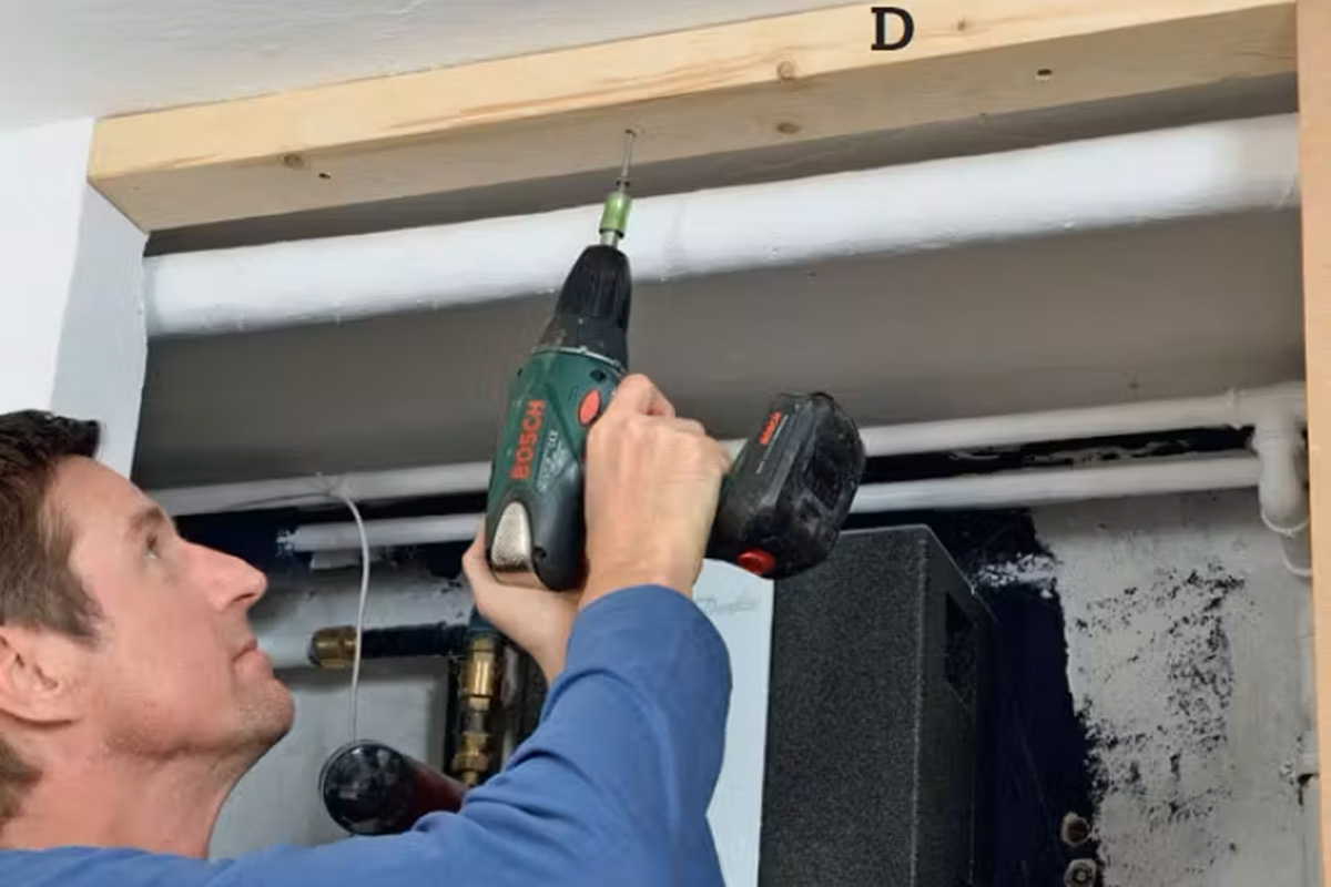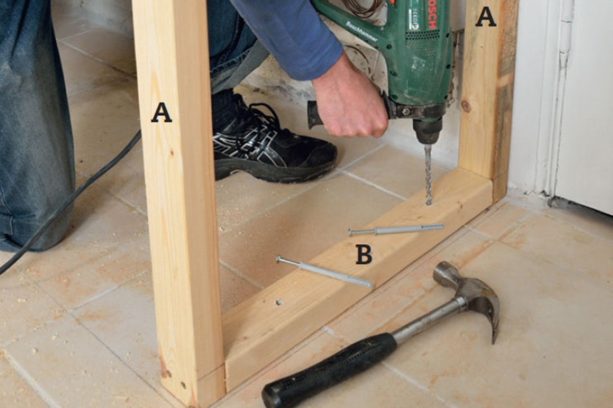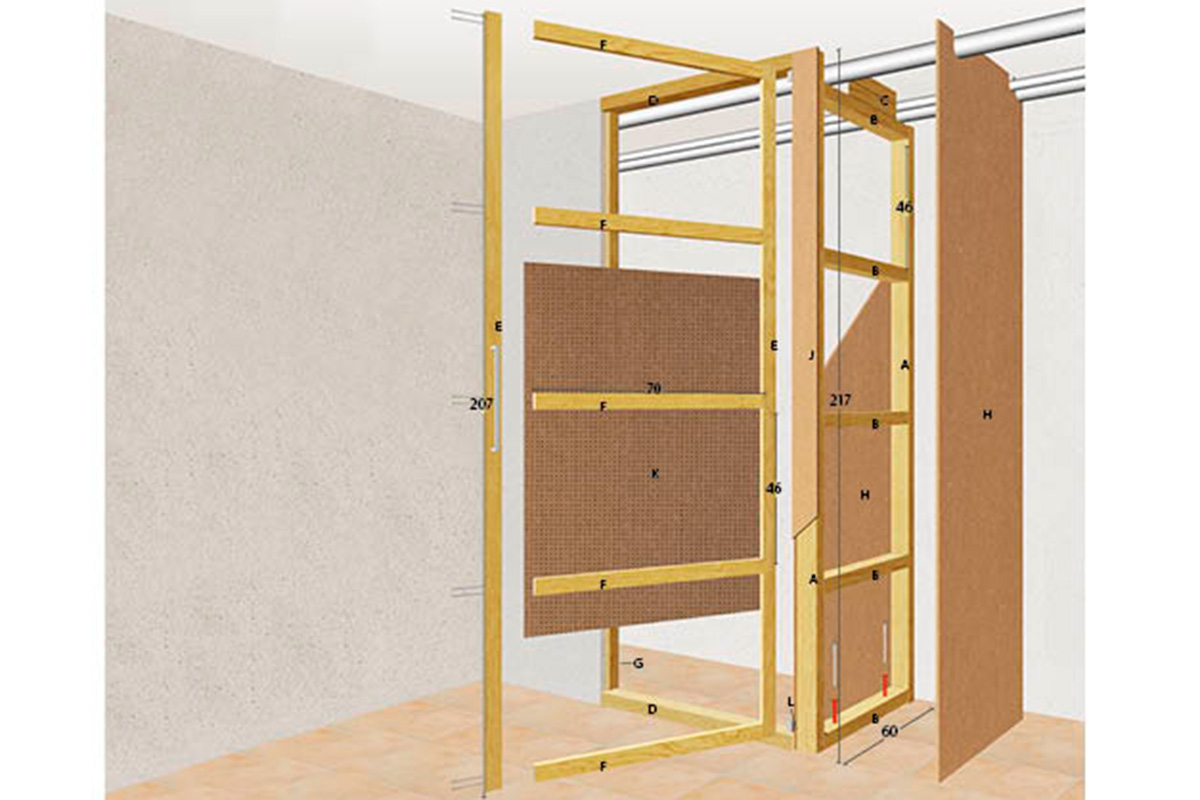 Riippumatta siitä, rakennatko irrallista kaappia vai asennatko sen seinän jat-keeksi, ensin on rakennettava puurunko uudelle kaappiseinälle. Se peittää putket ja siinä on oviaukko kulkua varten.