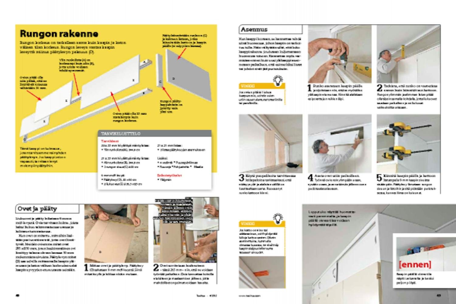Kun kaappi kootaan, se kannattaa tehdä siinä huoneessa, johon kaapin on tarkoi-tus tulla. Näin vältytään siltä, että koko kaappirakenne joudutaan kuljettamaan huoneesta toiseen. Kannattaa myös var-mistaa ennen kuin uusi yläkaappi asennetaan paikalleen, että esimerkiksi listat tai johdot eivät jää puristuksiin.
