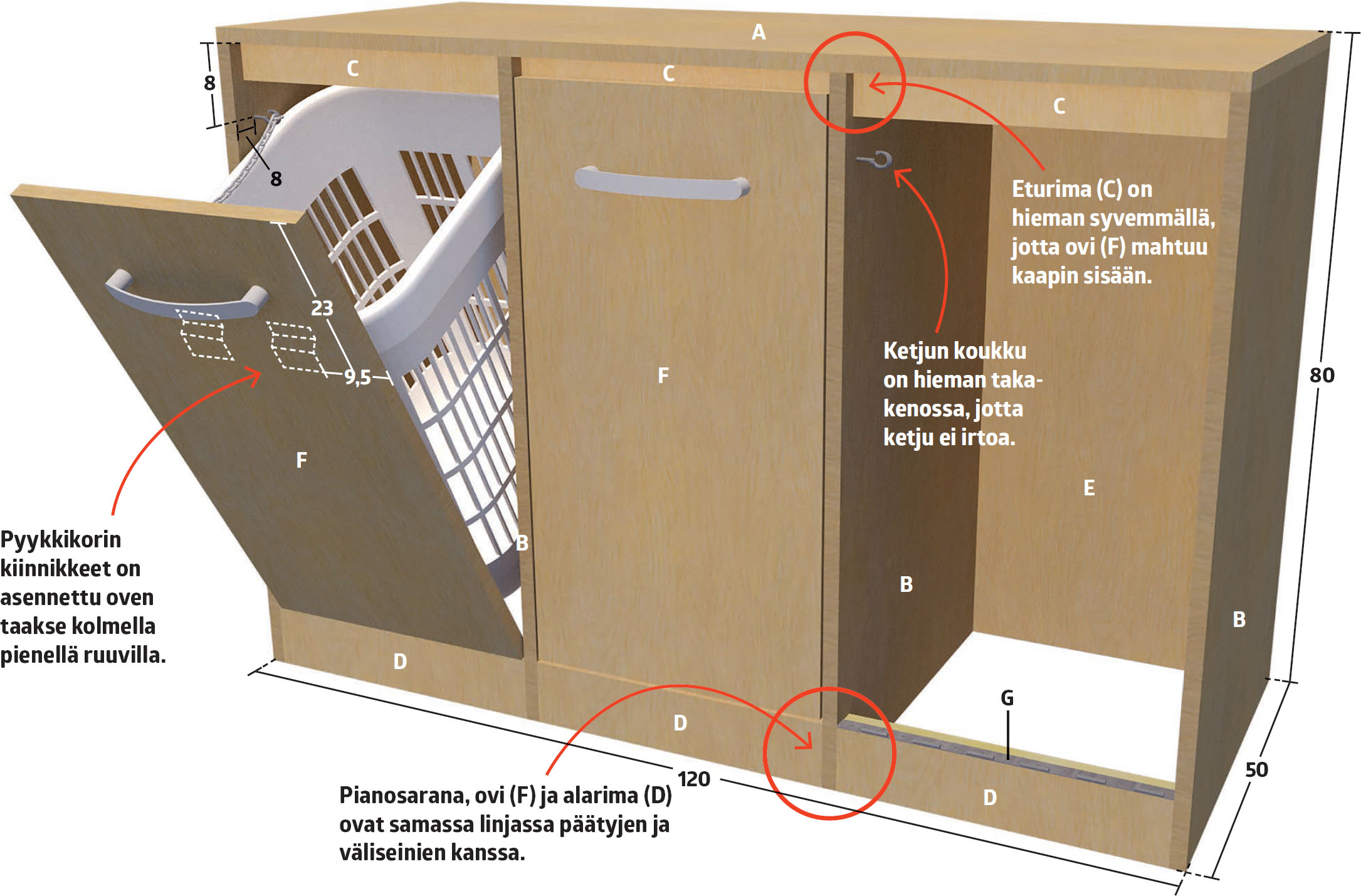 Tämä kaappi ei ole perinteistä mallia, jossa ovet avautuvat sivulle ja pyykkikorit ovat hyllyllä tai lattialla. Saranat asennetaan ovien alareunaan ja korit kiinnitetään ovien sisäpuolelle, jotta ne tulevat esiin, kun ovi avataan.
