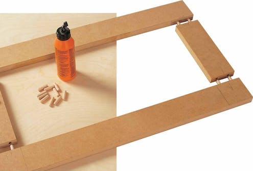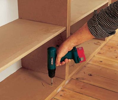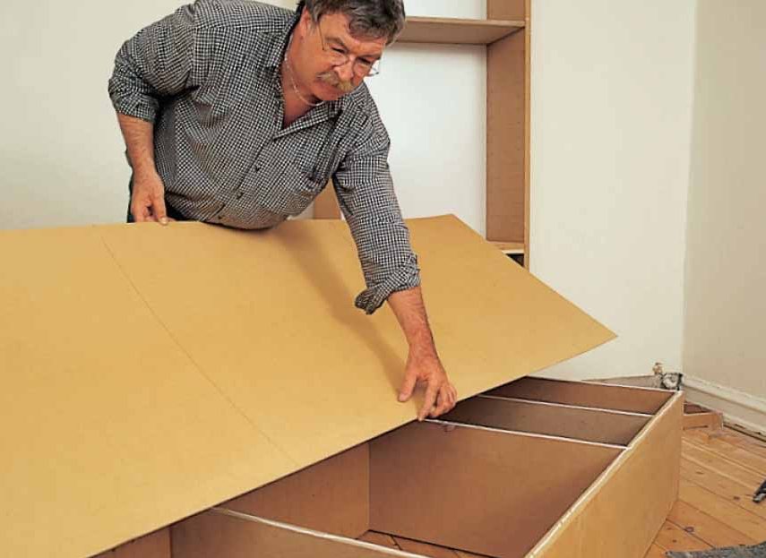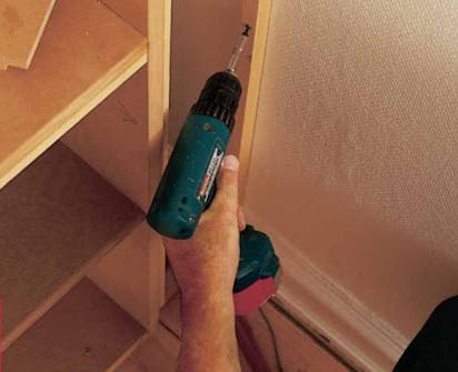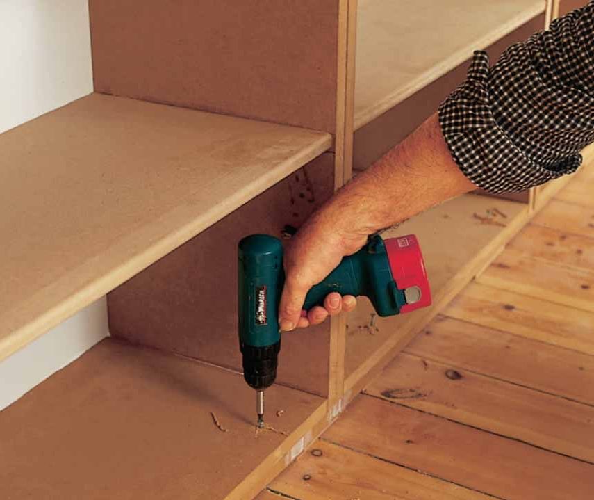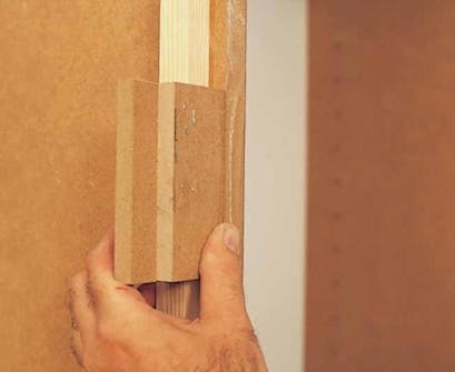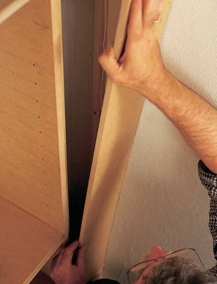 Reunan peitelistat sovitetaan tarkasti hyllykön laita- ja päällipuolen levyjen tasalle. Asentaja on tehnyt mittakapulan sovitusta varten.