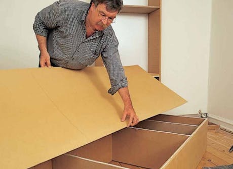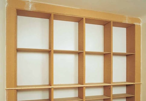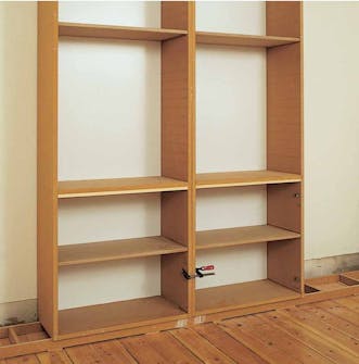 Mallityössä seinien puolelle jäi sovitusvaraa noin 180 mm ja pystysuunnassa eli katon ja lattian välille 190 mm. Hyllykkö reunustetiin sen vuoksi peitelistoilla, jotka sahattiin 12 mm lastulevystä.