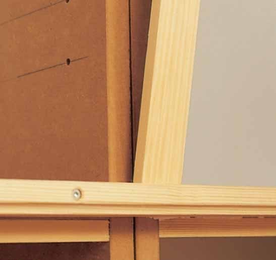 Vierekkäisen asennettujen hylly-moduulien sivuseinät eivät olisi viimeistelemättä kaunis yksityis-kohta, koska väliin jäisi rako eikä sovituskaan varmaan olisi aivan millintarkka. Siksi reunat päällys-tettiin listalla. Kaapinovien väliin-kään ei jää juuri rakoa, sillä ne on saranoitu paikallaan kääntyvillä upposaranoilla.