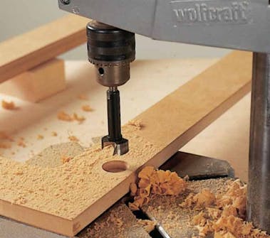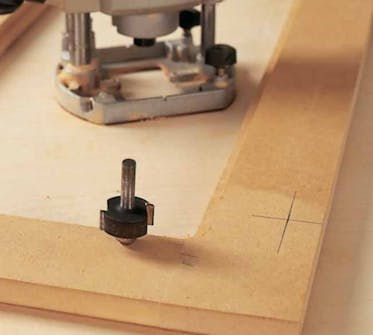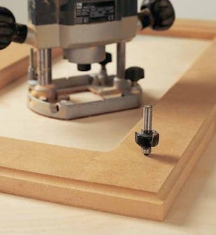 Peililevyn huulloksen jyrsinnän jälkeen ovien ulkosyrjiin jyrsitään muotoviisteet, jotka antavat oville koristeellisen ulkonäön. Kuvassa ohjaintapilla varustettu jyrsinterä.