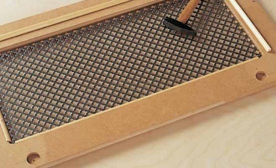 Takaseinä (E) tehtiin 4 mm kovalevystä. Sen voi kiinnittää pienikantaisilla 20 mm nauloilla 10 cm välein tai nitojalla. Kiinnitysvaiheessa pitää tarkastaa rungon suorakulmaisuus.