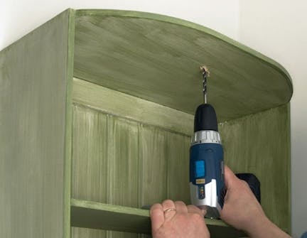 Poraa ensin reiät hyllykön sivuihin (A1 ja A2) kohtiin, jossa pohja (B2), keskihylly (B1) ja yläkappale (C) sijaitsevat. Käytä 2,5 mm puuporaa ja hyödynnä pylväsporakonetta, mikäli mahdollista.