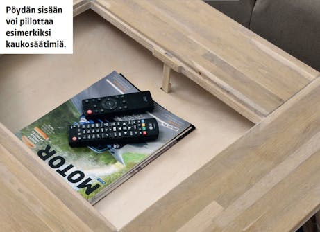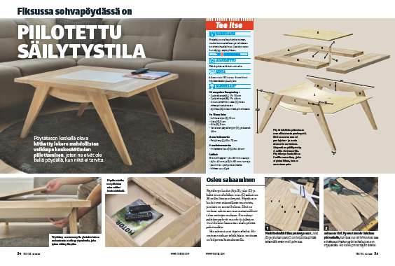 Piilotettu säilytystila avataan yksinkertaisella mekanismilla. Listasta tehty palikka nostaa pöytälevyn liikkuvaa osaa muutaman sentin ylöspäin, ja sitten voit nostaa levyn kokonaan ylös sormilla.