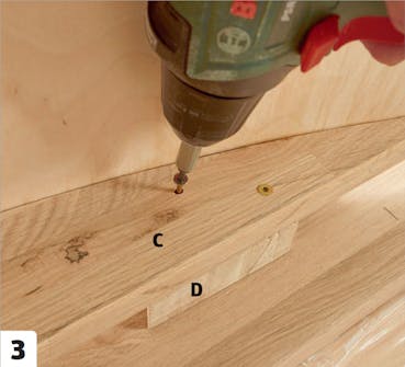 Esiporaa 4 millin poranterällä kohtiin, joissa jalat (D) on asennettava reunuskehikkoon (C). Jalkojen paikat merkitään ensin lyijykynällä.