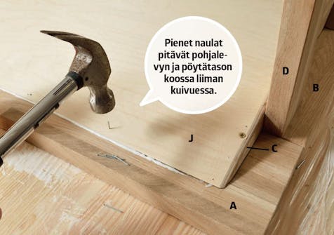 Reunuskehikko pitää pöydän koossa. Se tehdään kiinnittämällä pohjalevy (J) kahteen reunuskehikon osaan (C). Näin pöytälevyn alle jää samalla tyhjä tila. Se on ontto tila, jota voi käyttää myöhemmin säilytystilana. Jalkojen (D) ruuvit piilotetaan kiertämällä ne kiinni sisäpuolelta.