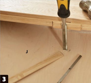 Pohjalevy (J) kiinnitetään reunuskehikon osien (C) kaarevalle puolelle liimalla ja 1,2 x 20 millin nauloilla. Pyöristä sitten pohjalevyn kulmat hiomapaperilla.