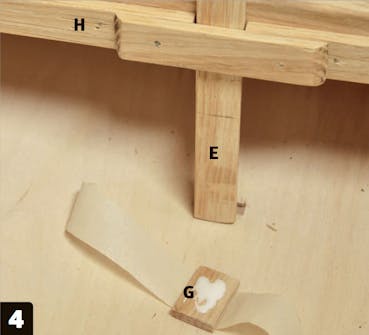 Pieni lista (F) asennetaan aukon päälle liimalla ja nauloilla. Lukitussalpa (E) asetetaan aukkoon pystysuoraan, ja sen osumakohta pohjalevyyn (J) merkitään.