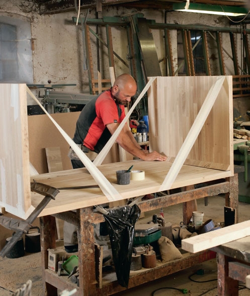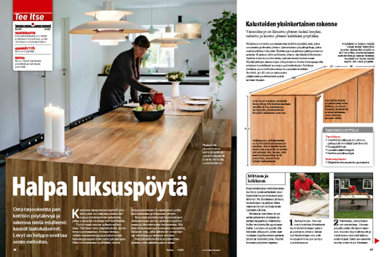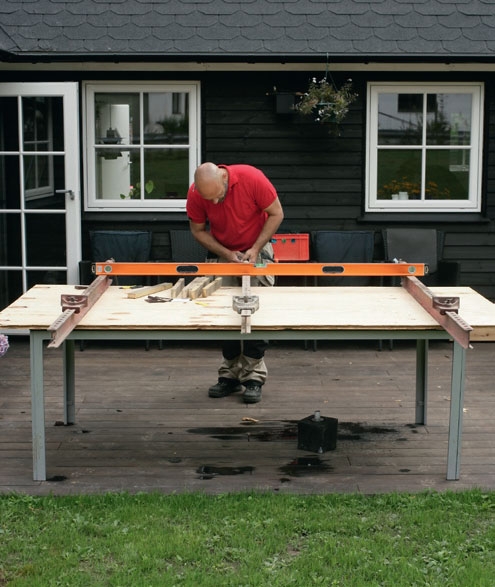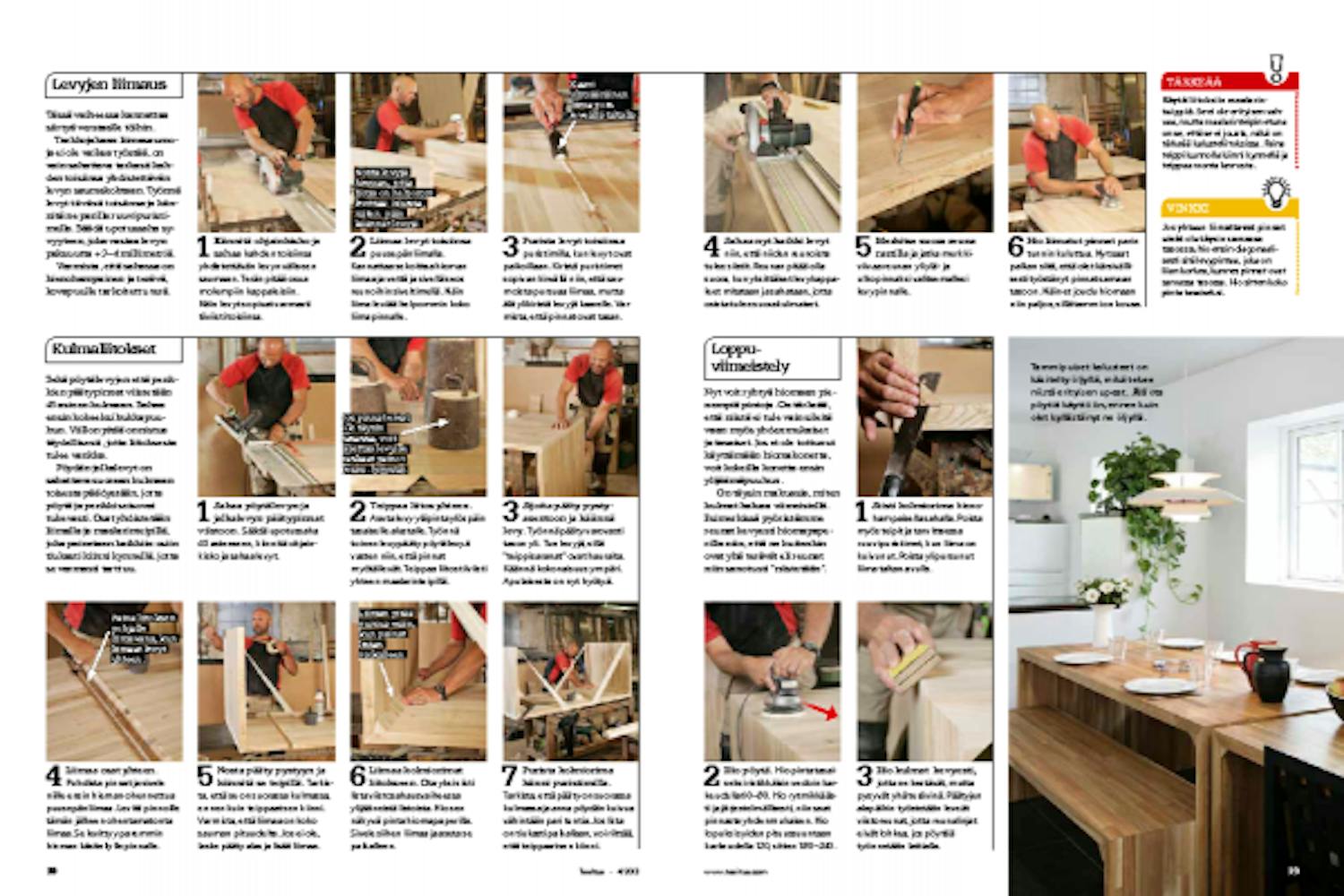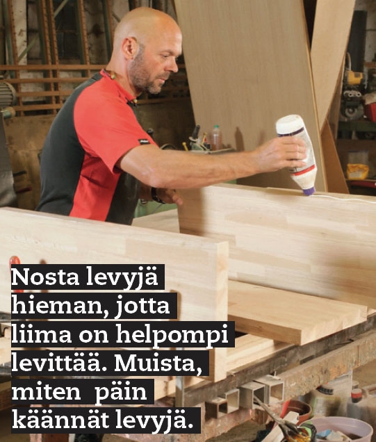 Ensimmäiseksi valmistetaan iso levy, josta sahataan puolentoista levyn kokoiset pöytälevyt. Ne liimataan yhteen. Isokokoiset ja paljon tilaa vaativat levyt on helpointa työstää ulkona.