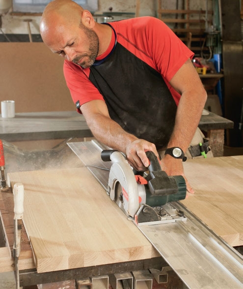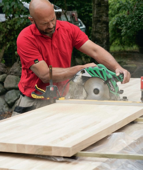 Sahaa pöytälevyn ja jalkalevyn päätypinnat viistoon. Säädä upotussaha 45 asteeseen, kiinnitä ohjain-kisko ja sahaa levyt.