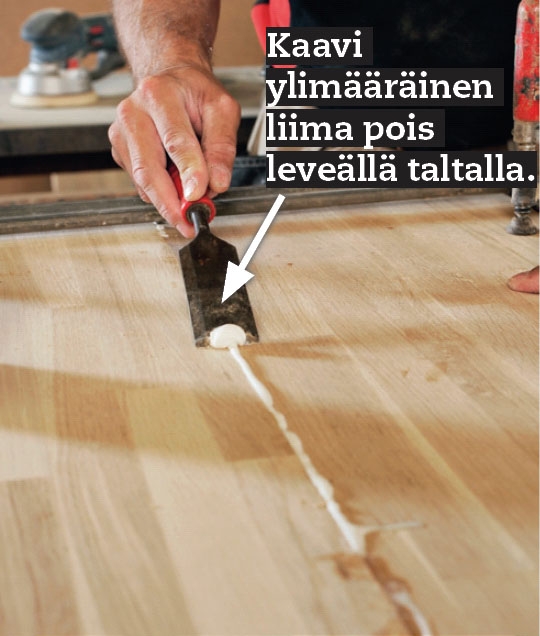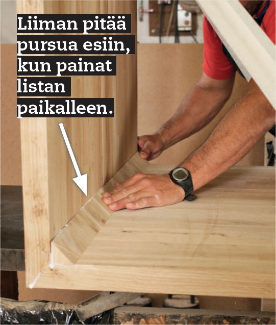 Siisti kolmiorima hienohampaisella sahalla. Poista myös teipit ja tarvittaessa ruuvipuristimet, kun liima on kuivunut. Poista ylipursunut liima taltan avulla.