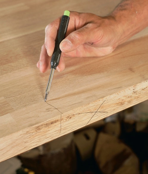 Merkitse suora reuna rastilla ja jatka merkkiviivaa reunan yli ylä- ja ulkopinnaksi valitsemallesi levypinnalle.