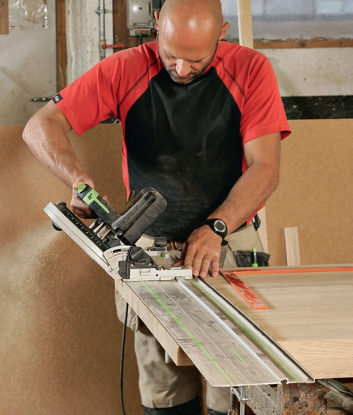 Kiinnitä ohjainkisko ja sahaa kahden toisiinsa yhdistettävän levyn väliseen saumaan. Terän pitää osua molempiin kappaleisiin. Näin levyt sopivat varmasti tiiviisti toisiinsa.