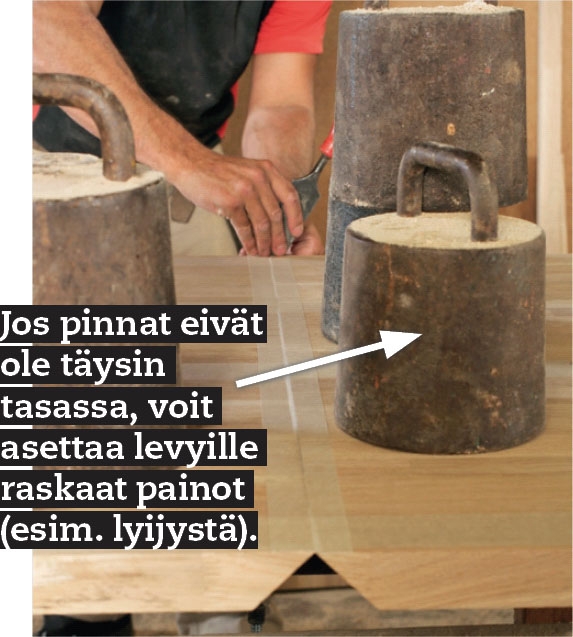 Purista levyt toisiinsa puristimilla, kun levyt ovat paikoillaan. Kiristä puristimet sopivan kireällä niin, että saumoista pursuaa liimaa, mutta älä ylikiristä levyjä kaarelle. Varmista, että pinnat ovat tasan.