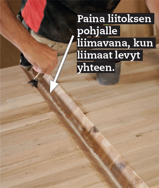 Tarkkojakaan liimasaumoja ei ole vaikea työstää, on vain sahattava tarkasti kahden toisiinsa yhdistettävän levyn saumakohtaan. Työnnä levyt tiiviisti toisiinsa ja kiinnitä ne parilla ruuvipuristimella. Säädä upotussaha sy-vyyteen, joka vastaa levyn paksuutta + 3-4 millimetriä. Varmista, että sahassa on hienohampainen ja terävä, kovapuulle tarkoitettu terä.