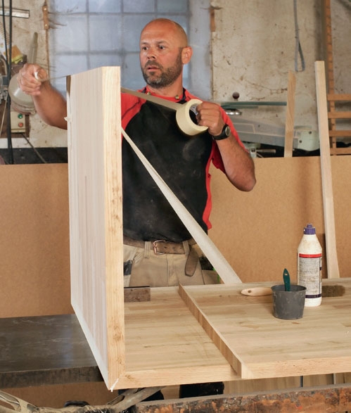Pöydän jalkalevyt on sahattava suoraan kulmaan toisesta päädystään, jotta pöytä ja penkki seisovat tukevasti. Osat yhdistetään liimalla ja maalarinteipillä, joka painetaan kaikkiin osiin tiukasti kiinni kynnellä, jotta se varmasti tarttuu.