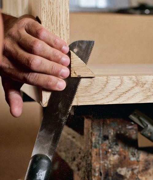Sekä pöytälevyjen että penkkien päätypinnat viistetään 45 asteen kulmaan. Sahaa ensin kokeeksi hukkapuuhun. Viillon pitää onnistua täydellisesti, jotta liitoksesta tulee vankka.