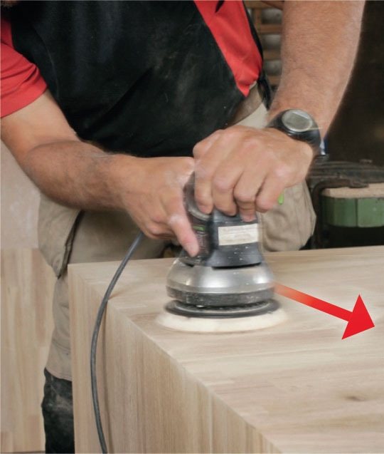 Hio pöytä. Hio pinta tasaiseksi ristikkäisin vedoin kar-keudella 60-80. Hio rytmikkäästi ja järjestelmällisesti, niin saat pinnasta yhdenmukaisen. Hio lopuksi syiden pituussuuntaan karkeudella 120, sitten 180-240.