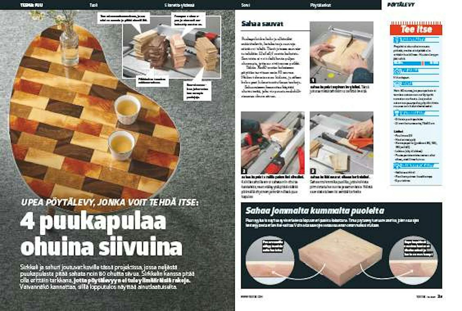 Seuraavana päivänä liima on kuivunut, ja levyn voi sahata oikean muotoiseksi. Kaarevien muotojen sahaamiseen tarvitaan pistosahaa. Jos teet levystä nelikulmaisen, voit käyttää käsisirkkeliä.