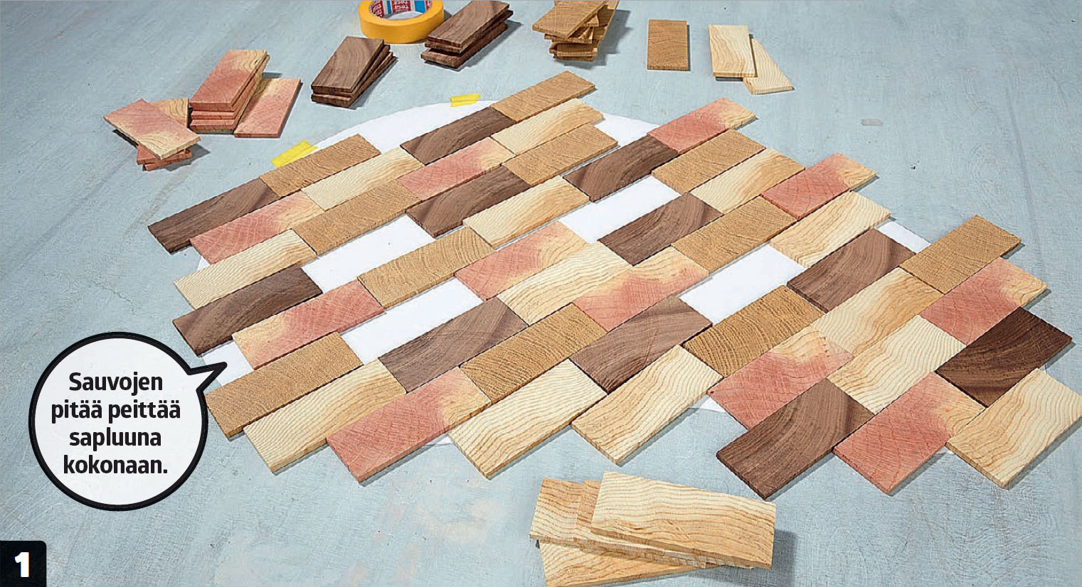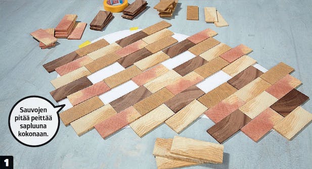 Asenna sauvat haluamaasi järjestykseen siten, että ne peittävät sapluunan kokonaan. Levyn pinta on yläpuolella. Sapluuna on leikattu paperista, ja pöytälevystä tulee sen muotoinen.
