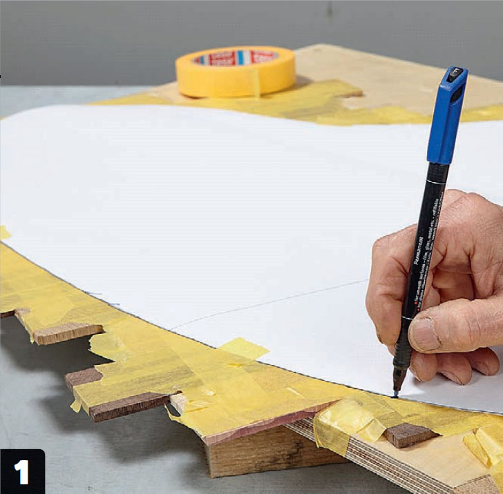 Piirrä pöytälevyn ääriviivat sapluunan avulla. Älä irrota teippejä, ennen kuin olet sahannut levyn.