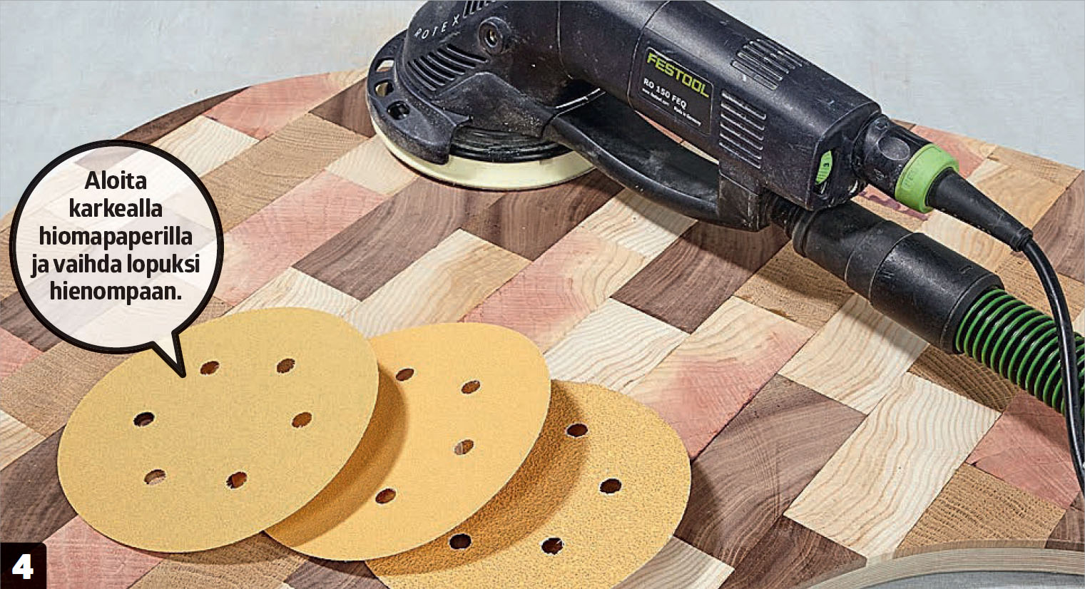 Hio pöytälevyn reunat hiomapaperilla. Käytä hiomatukea ja aloita jyväkoon 80 paperilla. Viimeistele pinnat koolla 240.