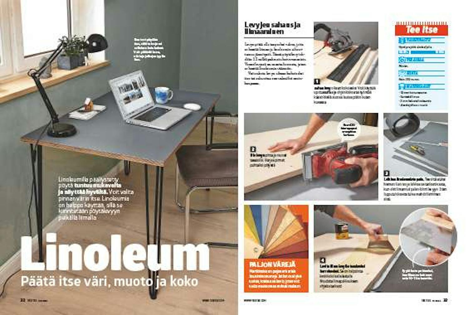 Levyn pitää olla tarpeeksi vahva, jotta se kestää liiman ja linoleumin aiheuttamaa jännitystä. Tämä pöytälevy teh dään 12 milliä paksusta koivuvanerista. Vanerilevyssä on monta kerrosta, joten se kestää linoleumin väännön.