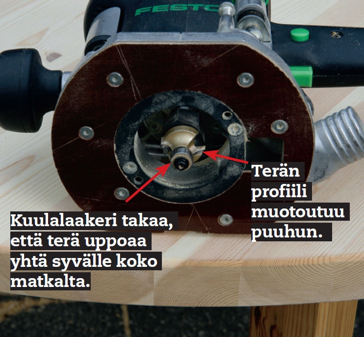 Reuna muotoillaan uudestaan - tähän tarvitaan eri kone. Yläjyrsin muotoilee reunan nopeasti ja tehokkaasti terämallinsa profiiliin. Kuulalaakeri kulkee pöydän reunaa pitkin ja ohjaa terää - me vain kuljetamme konetta ympäriinsä.