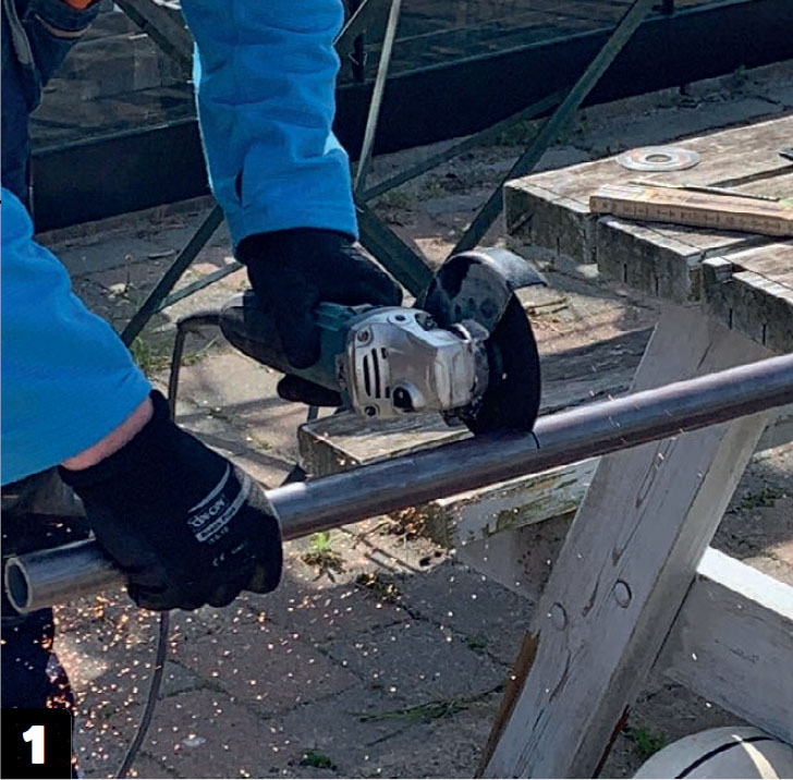Katkaise putket kulmahiomakoneella. Katkaise putki niin suoraan kuin voit. Pieni vinous ei kuitenkaan ole ongelma, sillä rakenteessa on hieman säätövaraa.
