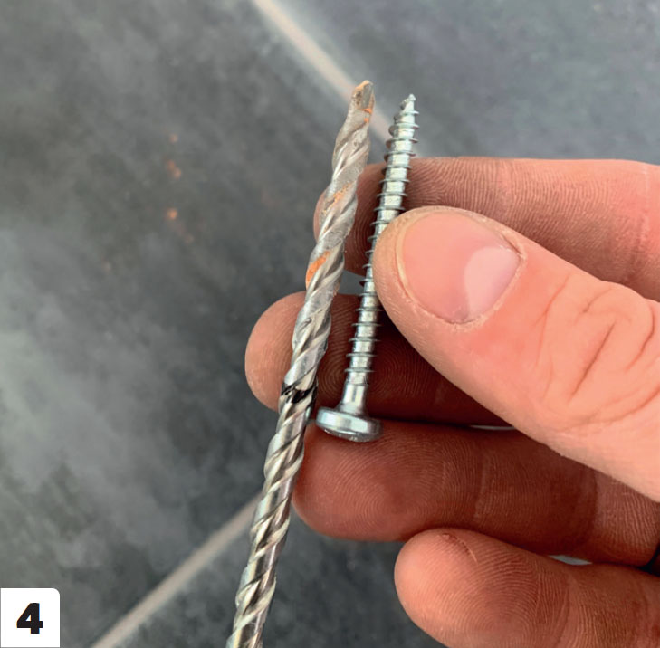 Hyvä niksi: Merkitse ruuvin pituus poranterään, jotta et poraa liian syvälle. Viiva kuluu pois, joten se on piirrettävä aina välillä uudelleen.