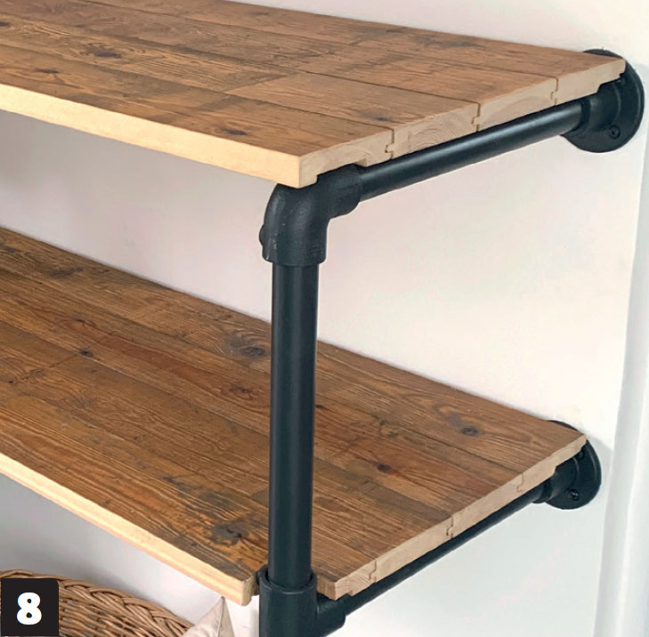 Olisimme voineet liimata hyllyt kiinni putkiin, mutta valitsimme mielestämme tyylikkäämmän menetelmän: jyrsimme monitoimileikkurilla liitoskappaleiden kohoumien vaatimat kolot. Siten hyllyt pysyvät putkien päällä eivätkä pääse liikkumaan.