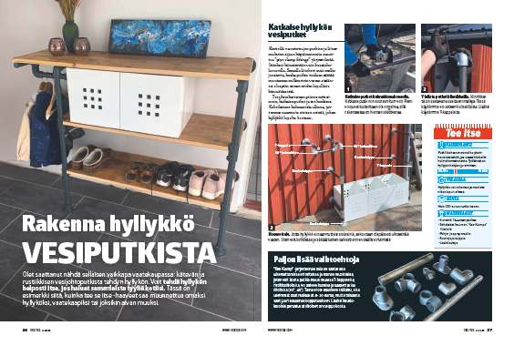 Tee yksinkertainen piirros mittoineen, katkaise putket ja tee koeliitos. Kokeilemme kokoamista ulkona, jottemme naarmuta eteisen seinää, johon hyllykkö lopulta kootaan.