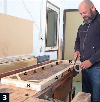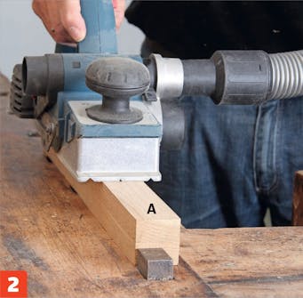 Säädä sähköhöylä siten, että jaloista (A) tulee 3,8x3,8 sentin kokoiset kahdella tai kolmelle työnnöllä. Sahaa lopuksi kaksi pohjarimaa (B). Ne ovat yhtä paksuja mutta 33,2 senttiä pitkiä.