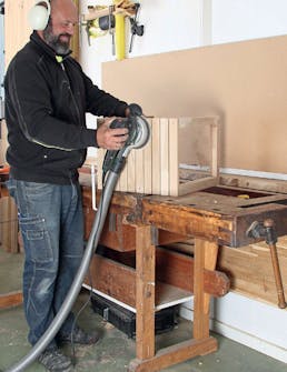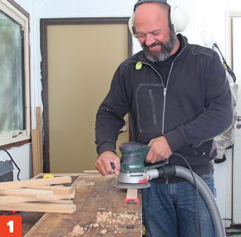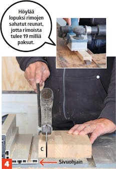 Tee rimat sillä aikaa, kun liima kuivuu. Purista rimat kiinni höyläpenkkiin yksitellen ja hio ne hyväkoon 240 hiomapaperilla. Pidä tiukasti kiinni hiomakoneesta, jotta rimojen reunoista ei tule vinoja.