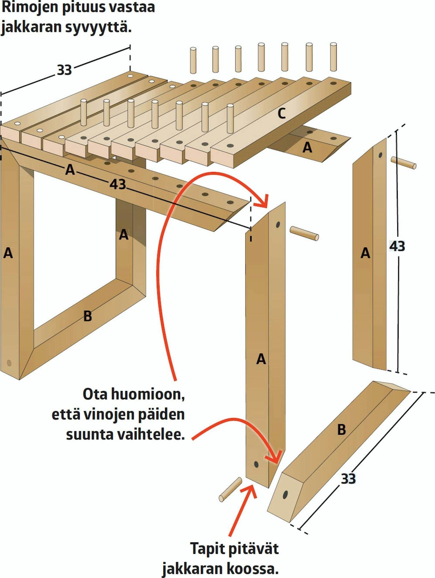 Levitä liimaa rungossa ja rimassa oleviin reikiin. Asenna ensimmäinen rima jakkaran päälle ja lyö molemmat tapit pohjaan. Muista jättää tappien päät noin 5 milliä ylipitkiksi.