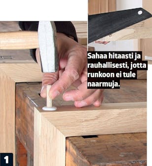 Levitä reikään liimaa ja lyö tappi niin syvälle, että sen pää jää noin 5 milliä levyn yläpuolelle. Sahaa tappi 1-2 millin pituiseksi pienihampaisella käsisahalla.