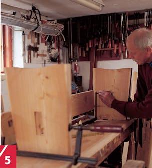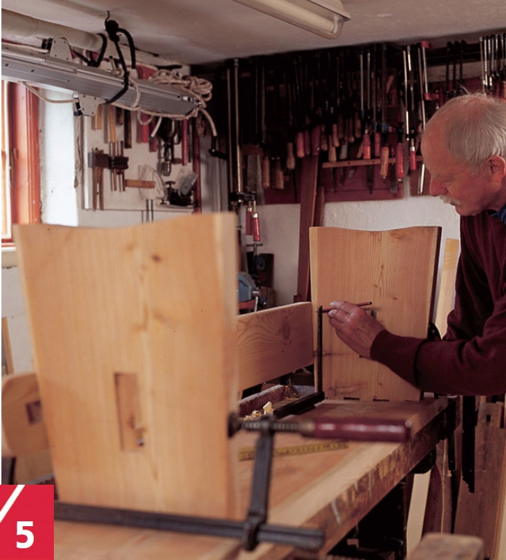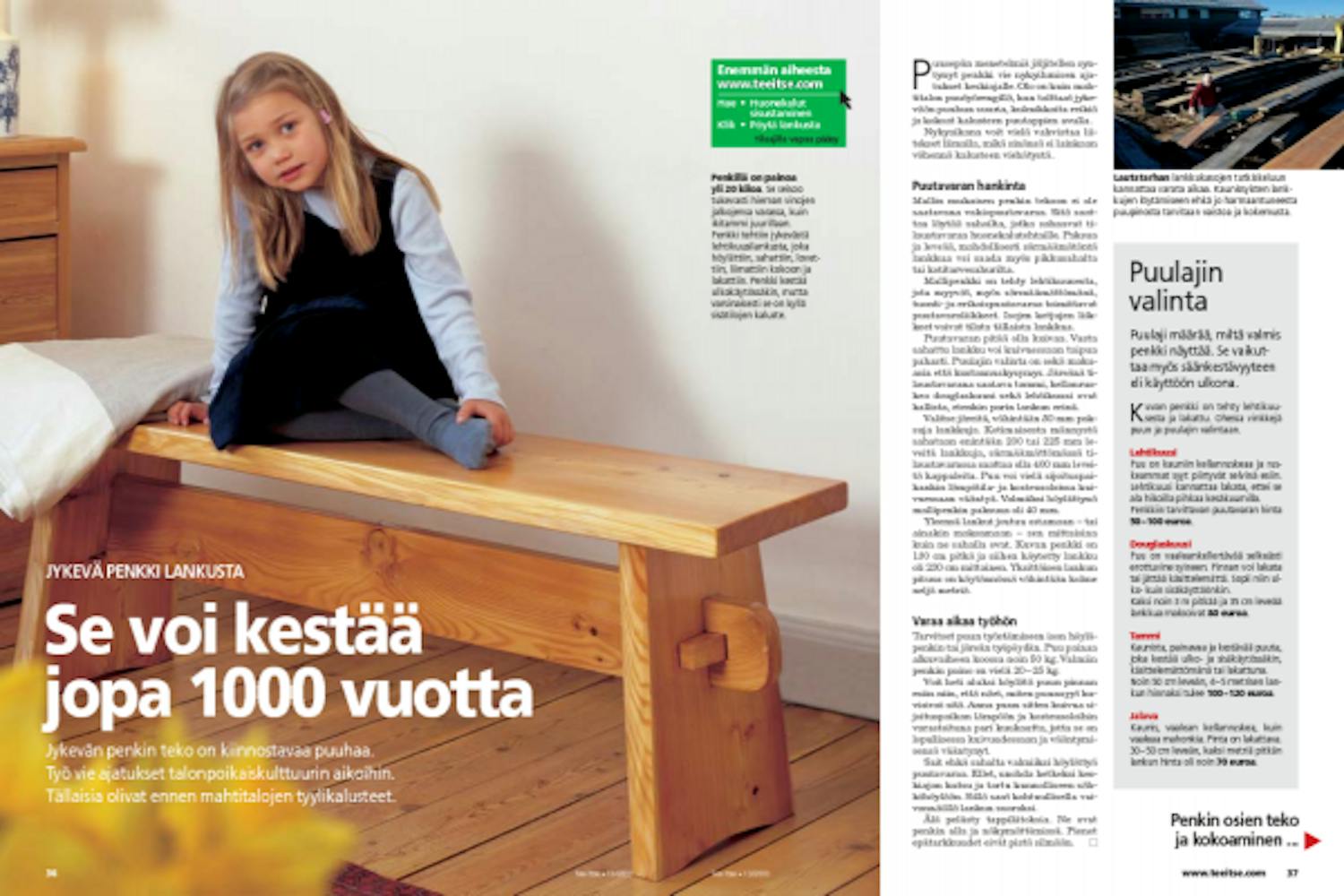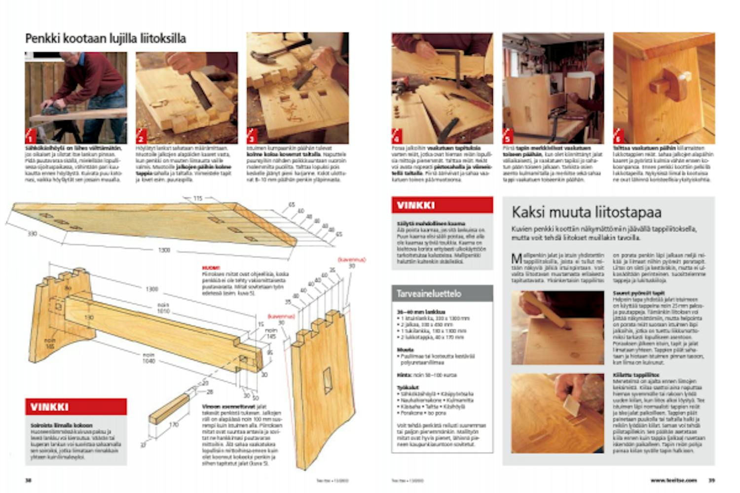 Höylätyt lankut sahataan määrämittaan. Muotoile jalkojen alapäiden kaaret vasta, kun penkki on muuten liimausta vaille valmis. Muotoille jalkojen päihin kolme tappia sahalla ja taltalla. Viimeistele tapit ja lovet esim. puuraspilla.