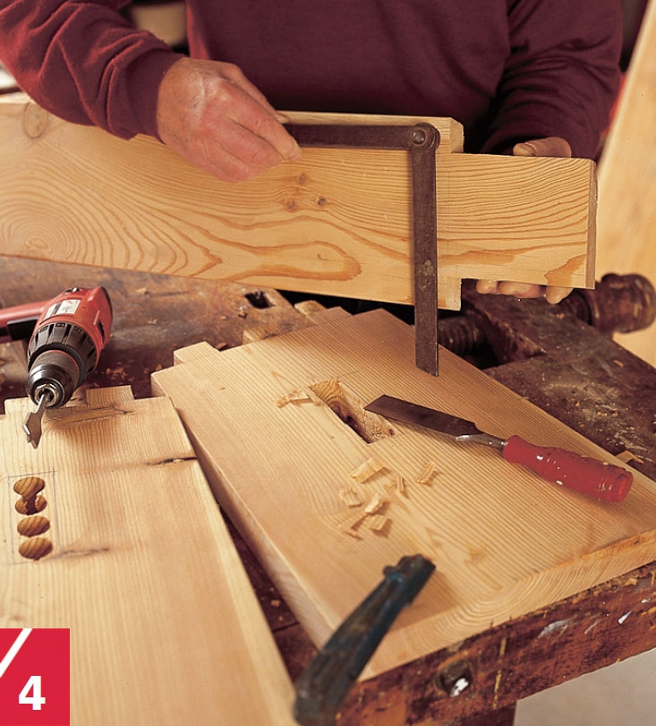 Poraa jalkoihin vaakatuen tapituksia varten reiät, jotka ovat hieman reiän lopulli-sia mittoja pienemmät. Talttaa reiät. Reiät voi avata nopeasti pistosahalla ja viimeis-tellä taltalla. Piirrä ääriviivat ja sahaa vaa-katuen toinen pää muotoonsa.