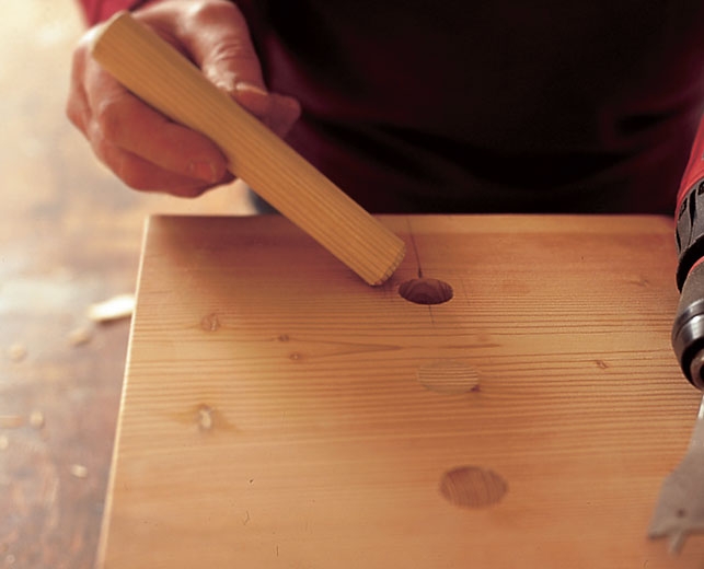 Helpoin tapa yhdistää jalat istuimeen on käyttää tappeina noin 25 mm paksuja puutappeja. Tämänkin liitoksen voi jättää näkymättömiin, mutta helpointa on porata reiät suoraan istuimen läpi jalkoihin, jotka on tuettu liikkumatto-miksi tarkasti lopulliseen asentoon. Porauksen jälkeen istuin, tapit ja jalat liimataan yhteen. Tappien päät saha-taan ja hiotaan istuimen pinnan tasoon, kun liima on kuivunut.