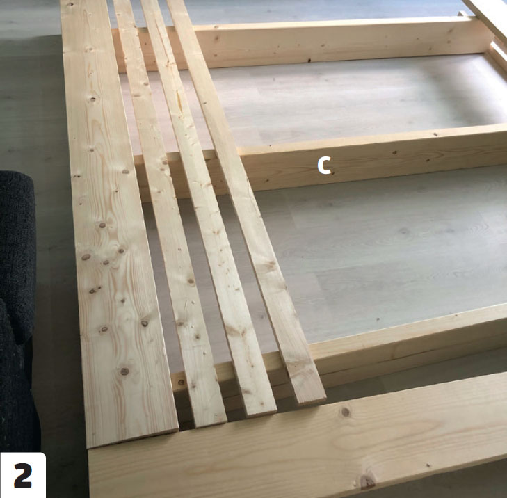 Purista kaikki kolme alapalkkia (C) yhteen. Merkitse suorakulmalla rimojen (E) paikat kaikkiin palkkeihin kerralla.