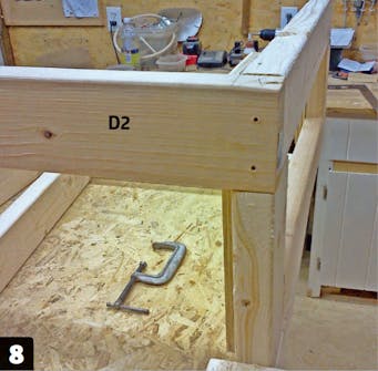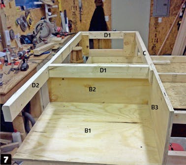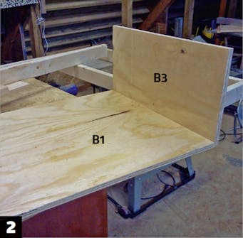 Kokoa rungon ulompi osa vanerilevyn (B2) ja nurkassa olevan lankunpätkän varaan. Ruuvaa poikkilankut (D1) jäykisteeseen (C) ja sängyn rungon ulko-osaan (D2).