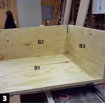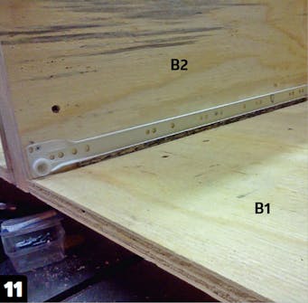Kohdista jäykiste (C) ja kiinnitä se muutamalla ruuvilla vanerilevyn (B3) takaosaan. Huomaa, että jäykiste on kiinnitetty toisesta päästä lyhyeen lankkuun.