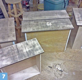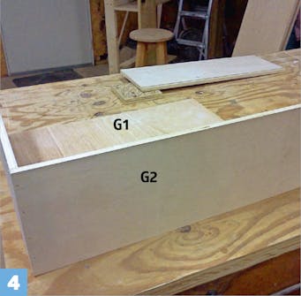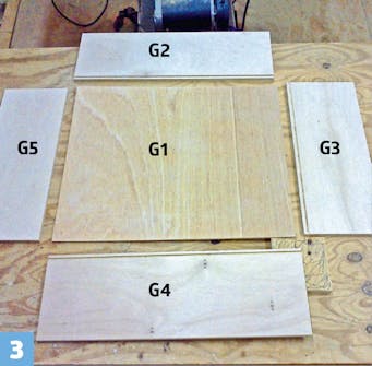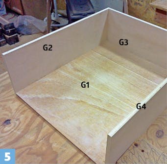 Sahaa laatikon sivuihin (G2, G3 ja G4) 6 milliä leveät urat 10 milliä alareunasta. Voit sahata levyt kahdessa erässä terällä, jonka paksuus on 3 milliä.