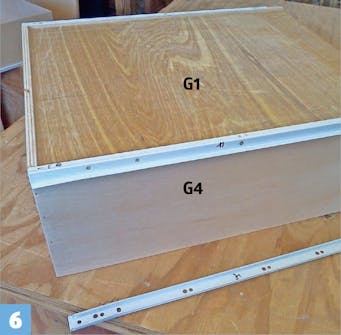 Ruuvaa kiskojen toiset puolet laatikon sivuihin (G4 + G2). Muista, että ruuvien pitää olla lyhyitä, koska sivulevyt ovat vain 15 mm paksuja.