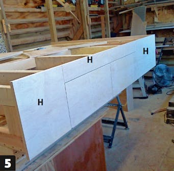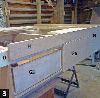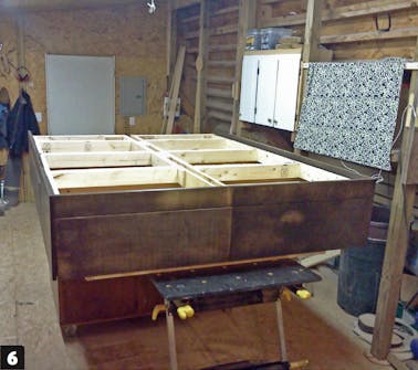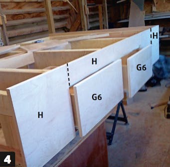 Lopputulos näyttää siistiltä, kun etulevyjen (G6) ja pohjalevyjen (H) väliin jää vain muutaman millin rako. Se tehdään sahaamalla etulevyt niin tarkasti kuin mahdollista ja asentamalla etulevyt yksi kerrallaan. Siten etulevyjä voi säätää muutaman millin vielä viime hetkellä. Lopuksi koko sänky petsataan tummaksi.